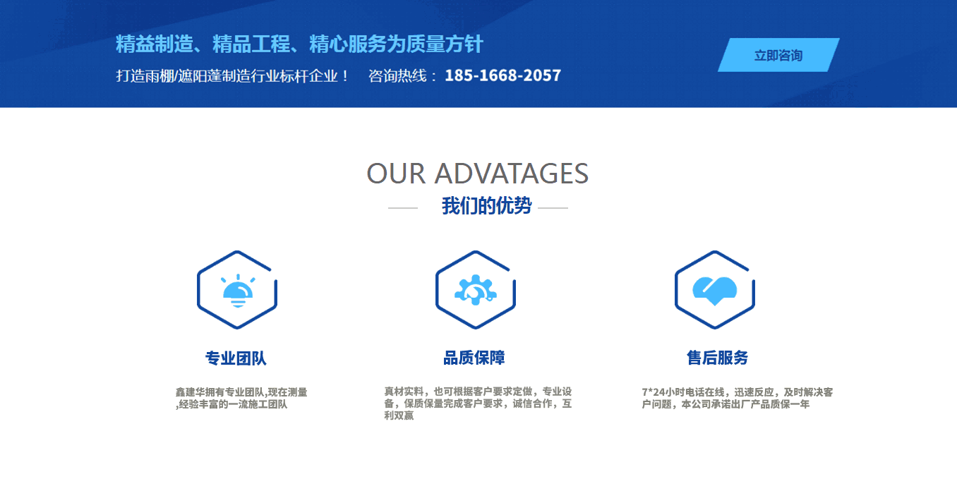 About us鑫建華雨棚有限公司成立于2012年,公司全體勵精圖治,飛速發(fā)展,已從初創(chuàng)業(yè)公司發(fā)展成為多元化公司,目前公司員工約1000余人,其中擁有中、高級專業(yè)技術人員100余人,形成以戶外制造產(chǎn)業(yè)為主,其他第三產(chǎn)業(yè)為輔的多元式經(jīng)營模式,旗下設有鋼結構公司,環(huán)保設備公司.其鋼結構公司主要以研發(fā),設計、生產(chǎn)、營銷、安裝、服務為一體的鋼結構生產(chǎn)制造型企業(yè),環(huán)保設備公司主要以“綠色環(huán)保節(jié)能“為核心戰(zhàn)略品牌.公司相關資質(zhì)齊備,主營業(yè)務:定制各種推拉蓬、活動雨棚、倉庫雨棚、智能電動蓬、伸縮電動噴漆房、懸空電動雨棚等手動,遙控電動一體,系列產(chǎn)品,公司總部位于中國.江蘇,目前,公司年經(jīng)營規(guī)模達8千萬以上,經(jīng)營區(qū)減已輻射全國大部份省會城市,在雨棚領域展露崢嶸,“鑫建華品牌“已成為國內(nèi)雨棚,在全國市場的占有率及品牌均名列前茅. 公司在蘇州、天津、重慶、武漢、濟南、鄭州、江門、衡陽均設有工廠,覆蓋全國主要城市、八倉生產(chǎn)制作安裝售后、國內(nèi)訂單全國范圍可上門安裝服務、國外訂單可派工程師出國指導安裝....